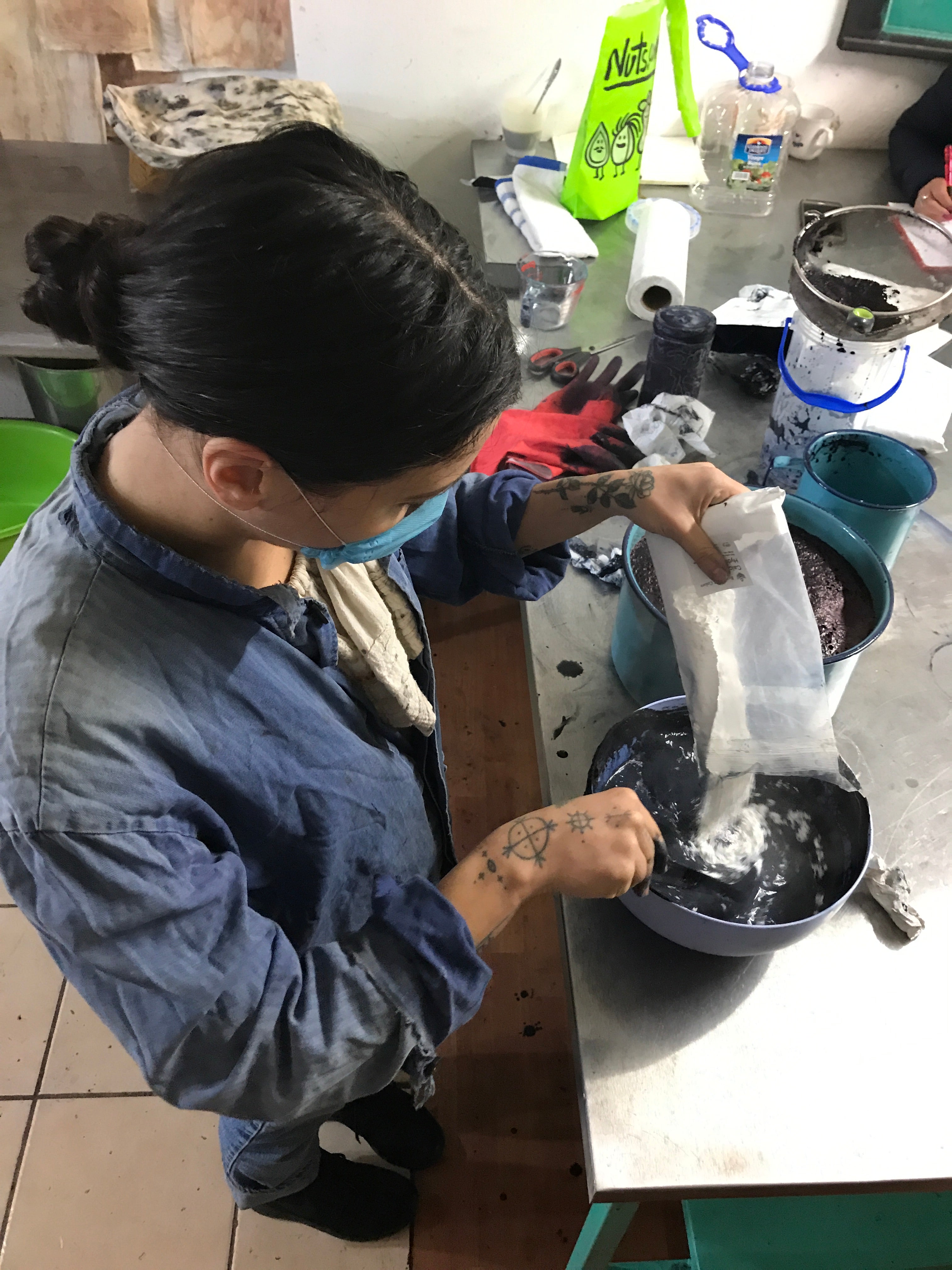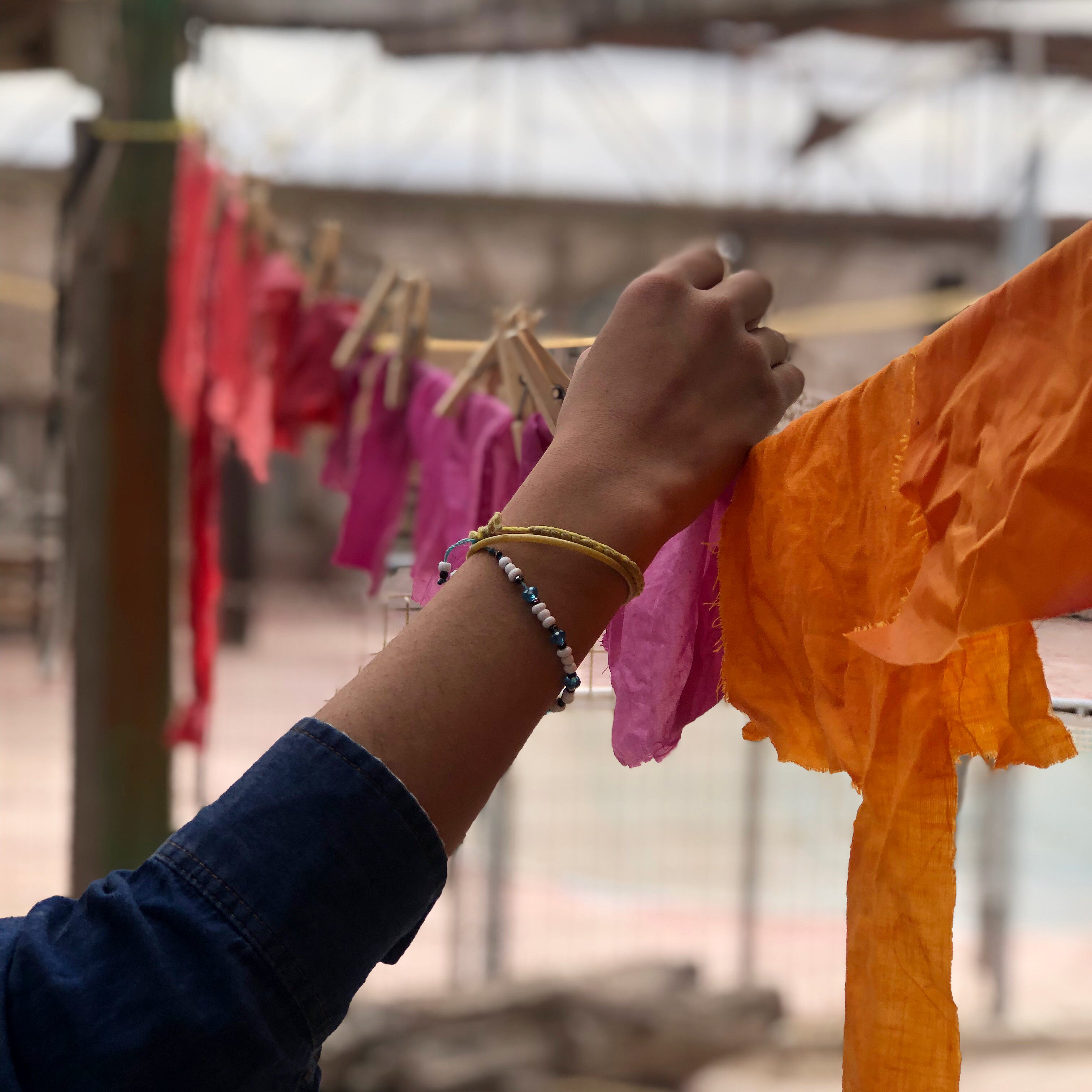 We work with plants, flowers, and roots (Indigo, Cochineal, Marigold, Gobernadora, Peruvian root, and St. John’s Wort) to bring our palette to life.